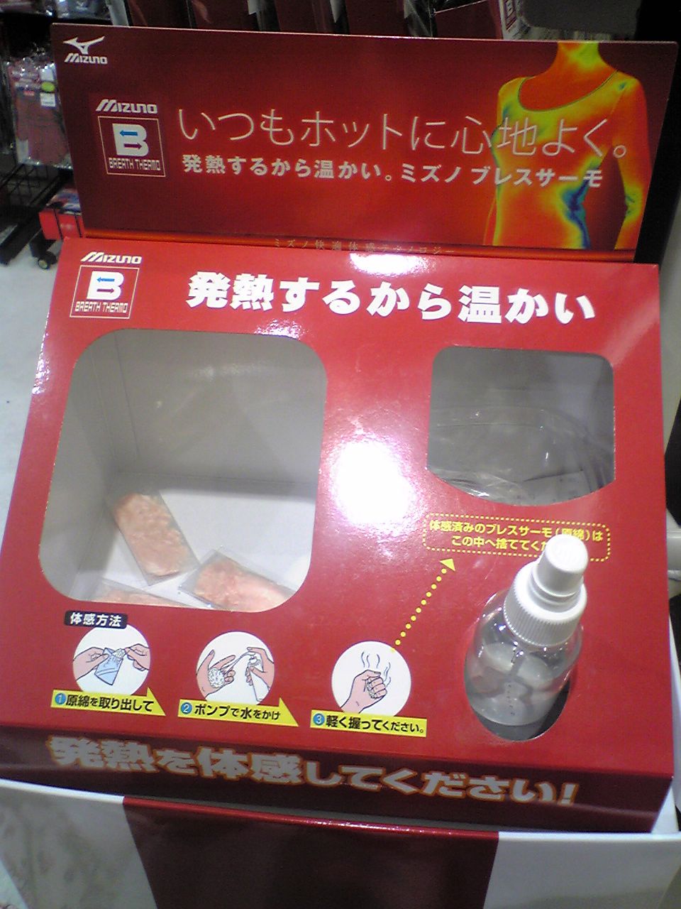 さっそく2Fのスポーツ ミツハシへ入ると、ミズノのブレスサーモ体験販促物。綿に水分を含ませたら温くなるという説明で、本当に温くなってました。雨に降られたら暑くて熱中症にならないのか等といったワケの分からない疑問が浮かびましたが何かしらスゴイ素材だと思います。
