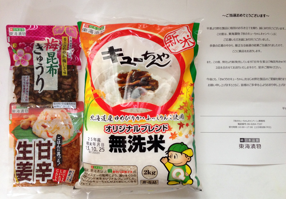 きゅうりのキューちゃん 無洗米2kgに当選! 梅昆布きゅうりと甘辛生姜のサプライズも